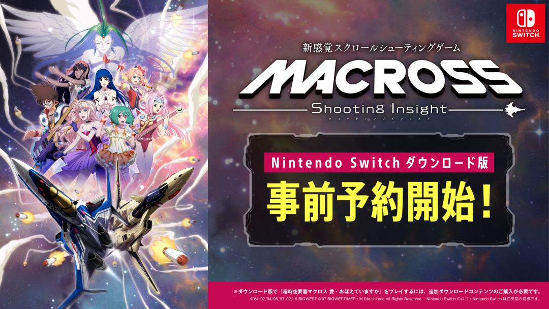 40年の歴史を誇り、長きにわたり多くのファンから愛され続けているSFアニメの金字塔「マクロス」シリーズの完全新作となる新感覚スクロールシューティングゲーム『マクロス -Shooting Insight-』のNintendo Switchダウンロード版が本日よりニンテンドーeショップ・マイニンテンドーストアにて事前予約を開始いたしました。また、同日販売開始予定の追加ダウンロードコンテンツ『超時空要塞マクロス 愛・おぼえていますか』のニンテンドーeショップ・マイニンテンドーストアでの事前予約は3月7日(木)を予定しております。