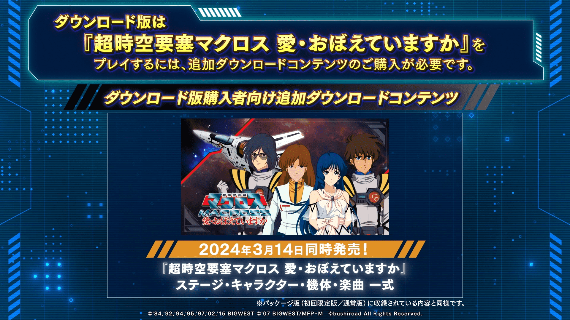Nintendo Switch/Steam追加ダウンロードコンテンツ:1,320円(税込)Nintendo SwitchおよびSteamダウンロード版で『超時空要塞マクロス 愛・おぼえていますか』ステージ・キャラクター・機体・楽曲をプレイするには、追加ダウンロードコンテンツのご購入が必要です。